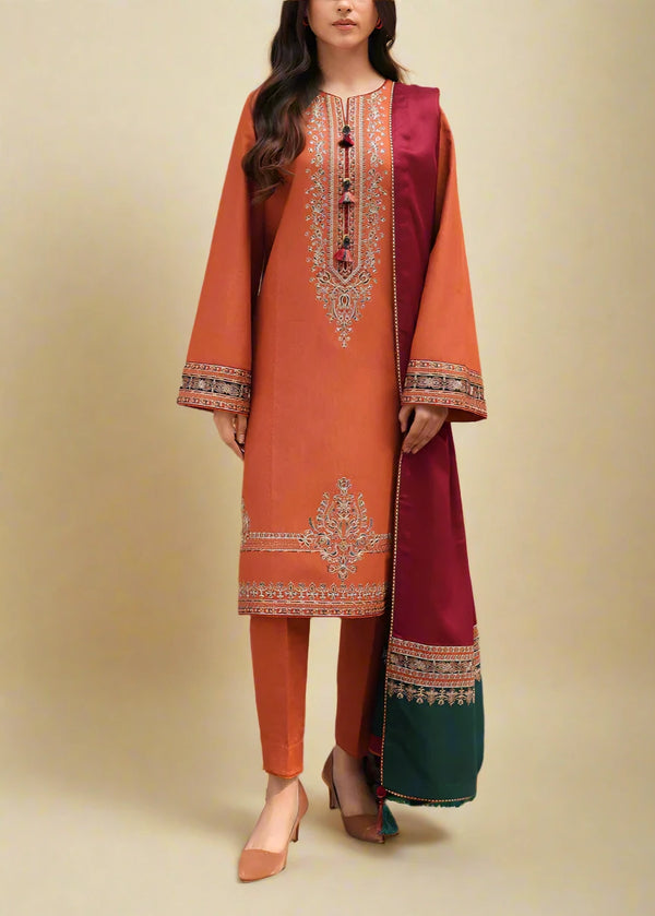 Fabric: khaddar Embroidered full front Plain dyed sleeves Plain dyed back & trouser Printed Polyester Wool shawl. Note: Model image is for inspiration purposes only. actual product may vary slightly in...